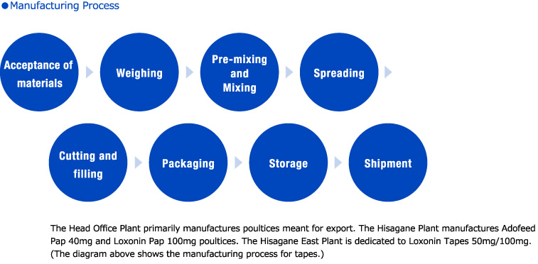 Our production plants, from which we have exported products worldwide for the past 20 years, conform to the GMP(2) requirements of various countries, such as Japan, the EU, and the US, while periodically responding to revisions in regulations, and we have completed compliance with PIC/S(3) GMP. In order to supply highly efficacious and safe transdermal absorption medicines not only within Japan but also to the rest of the world, we methodically conduct work with an eye to both domestic and international standards, proving worthy of the trust of our customers worldwide.